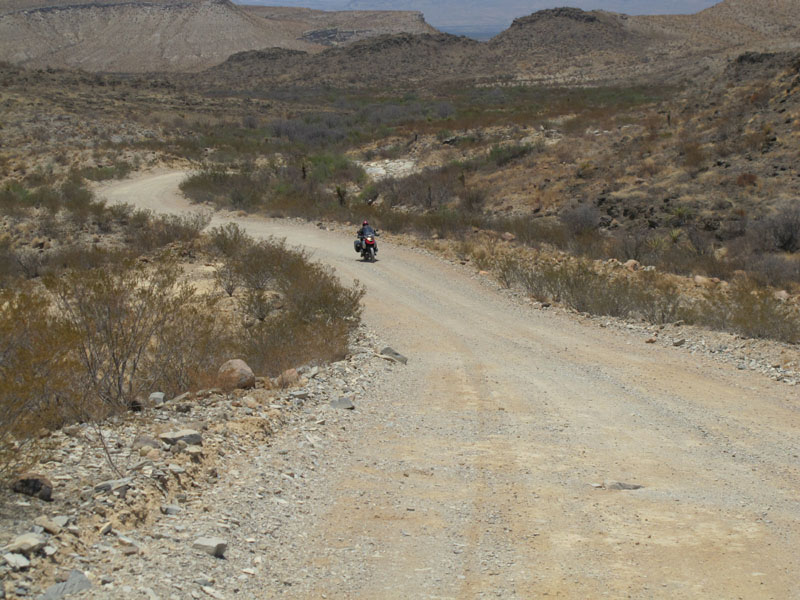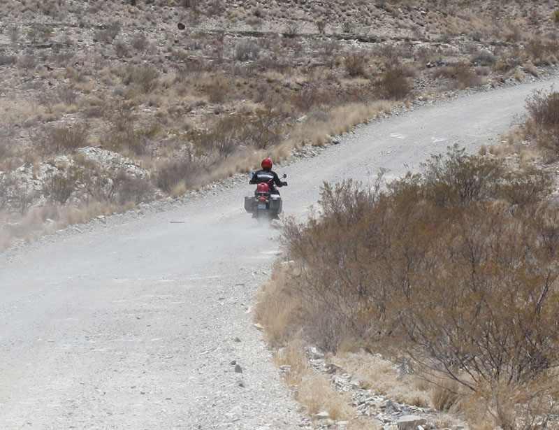 Beneath our wheels, the surface of Terlingua Ranch Road varied according to small degrees of elevation - along the ridges and higher stretches, it was packed dirt and gravel, easy enough to navigate. However, the lower-lying areas were deep, loose gravel and sand - the worst possible conditions for big, heavy bikes like ours. A berm of soft gravel or a deep rut filled with sand can take control of your front wheel, send the bike slewing around, and easily put you down. You always have to be ready to roll the power on, to keep the front wheel light - and to put a foot down sometimes, too, to keep the bike upright. Like riding in crosswinds, it was a constant wrestling match, and in such withering heat, it was another reason we didn't want to have to start picking up bikes. That would soon drain us completely.