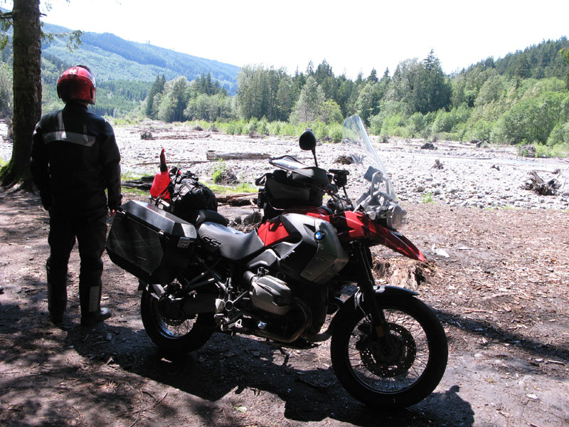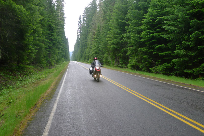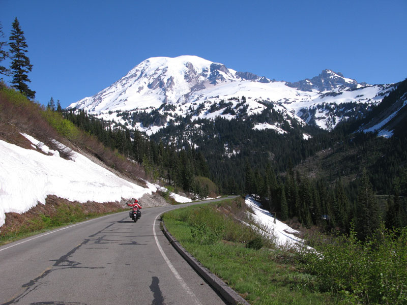 Usually we take Brian riding in the rain - it has always seemed to work out that way - but this time the weather-gods smiled upon him. And us. With Brian riding my spare bike, after the Vancouver show the three of us rode south from a town in Washington state called Sedro-Woolley (an irresistible name - though it should be noted that the town was originally called "Bug," which hints at another place with history). We curved along the foothills of the Cascades, then higher, toward the night's destination of Mount Rainier National Park.
