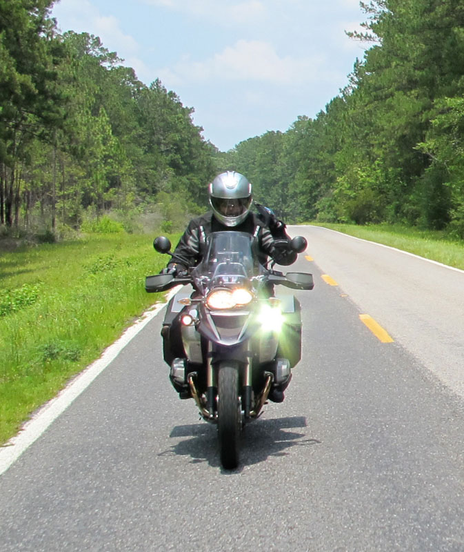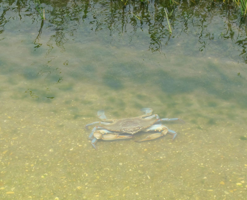 When I stopped to take the above photo of Michael's impressive fountain of spray, I put my boots down through the water to the road, and straddled my motorcycle. As I toed the shifter into neutral and grabbed the camera from my tankbag, I happened to look down, and was amazed to see a dinner-plate-sized crab scuttling by. I just stopped and stared, in surprise and delight, while the crab paused beside me, as if to hold his ground, and gave me a baleful look. I learned later that he was a male blue crab, called a "Jimmy" (young females are "Sallys," and older females "Sooks") - but at that moment, the germane fact was that the "territory" Jimmy was so ready to defend was the surface of the road.