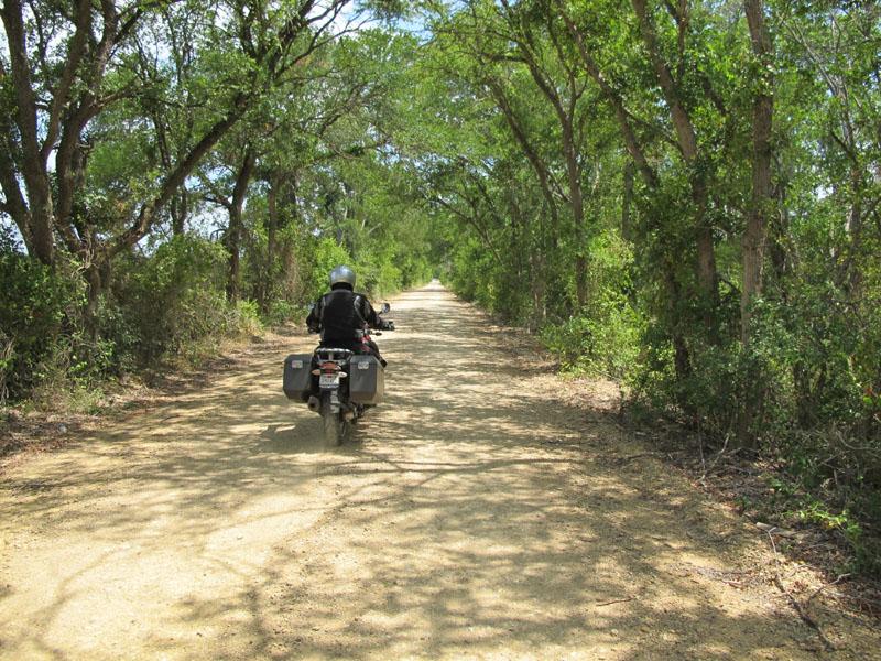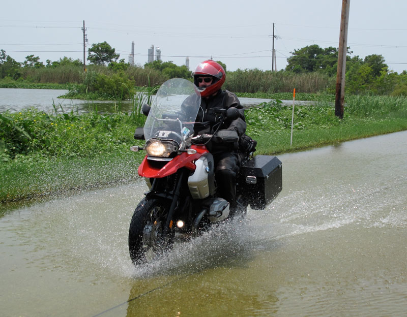 The dark green algae around him is convincing evidence that those stretches of road are flooded frequently, maybe always, and that algae was also very slippery under our wheels. In deeper stretches, the "bow wave" was strong enough to sweep my feet right off the pegs, while it splashed high over my windscreen and helmet.