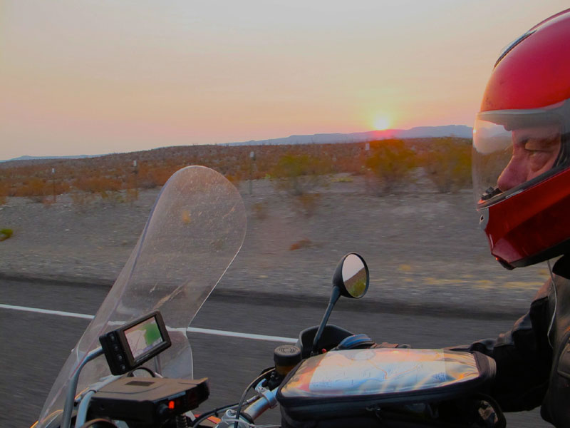 The haze along the horizon and around the rising sun in this photo tells another story - about the forest fires devouring huge areas of Arizona. As we loaded the bikes that mid-June morning, my nostrils picked up the unmistakable smell of burning forest - from almost 500 miles northwest of us. Normally Big Bend country, like Death Valley or Grand Canyon, has air so supernaturally clear that you can see the folds in mountains and canyons from many miles away, but all over the Southwest we would notice that smoke fuzzing the skies.