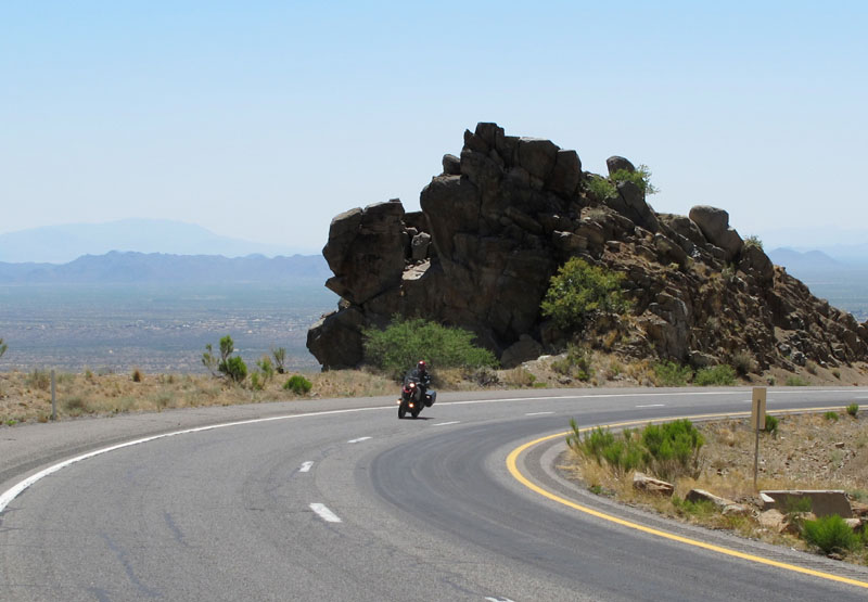 Michael and I followed an enjoyable, deserted two-lane blacktop north through the Vulture Mountains (great name for that deadly environment). Circling east, we climbed higher, into the Bradshaw Mountains, to Prescott (5,400 feet) for the night. As we followed the winding road upward in long sweeping bends, I watched the digital thermometer on my motorcycle fall, one or two degrees at a time, all the way down to a relatively cool 96 degrees.