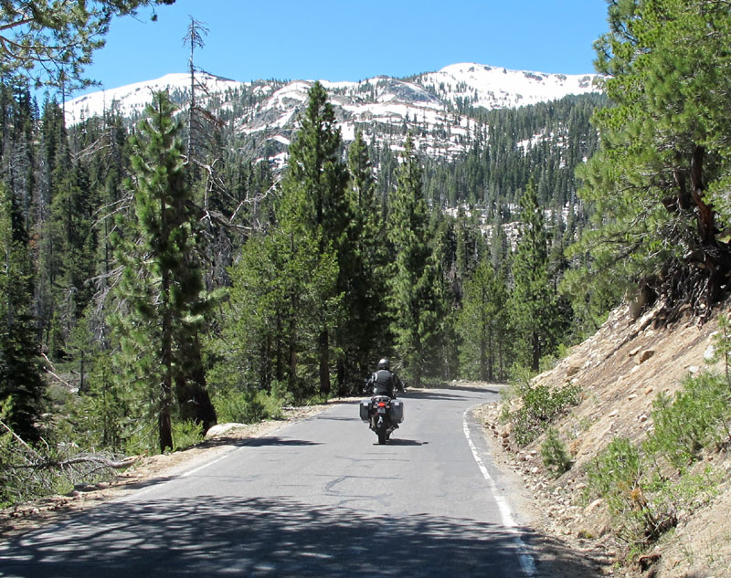 What a relief, then, in the days of late June, to climb into the Sierra Mountains of California - the Range of Light. We rode west from Reno across the Ebbetts Pass, at 8,730 feet, surrounded by cool thin air, sweet-smelling pine forests, and lingering banks of snow at the roadside. Like many of the Sierra passes, that road was shown on the map as "Closed in Winter," because of the great amount of snow the area received - averaging over forty feet annually.
