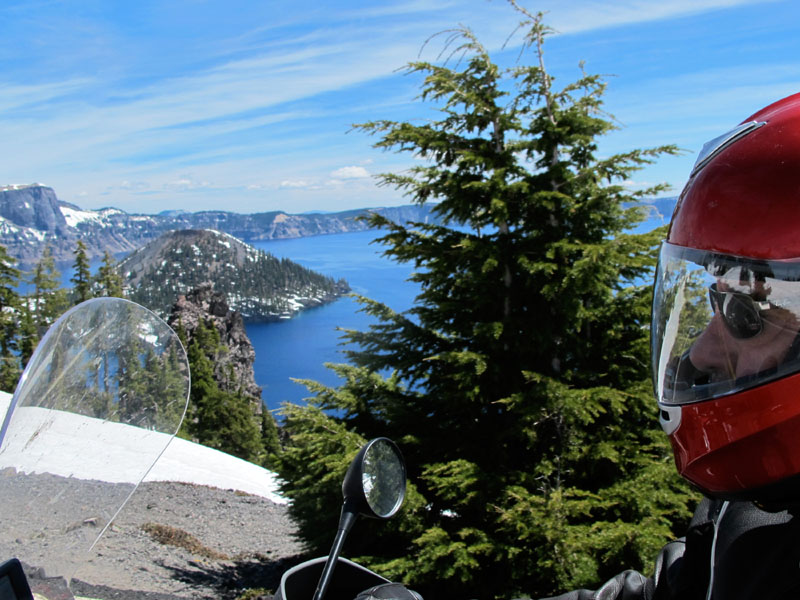 Here is a glimpse of Crater Lake in passing, with Wizard Island (the original volcano's cindercone) to the left.
