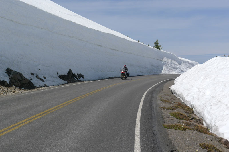 Michael and I had ridden through Crater Lake National Park the previous summer, in the opposite direction, with Greg Russell. That had been in August, and we had been able to ride all the way around the lake that time. Now it was June, and much of that East Rim Road still lay under the vast snowfields that remained - from the average forty-five feet of snow the area received each winter. Another land of extremes.