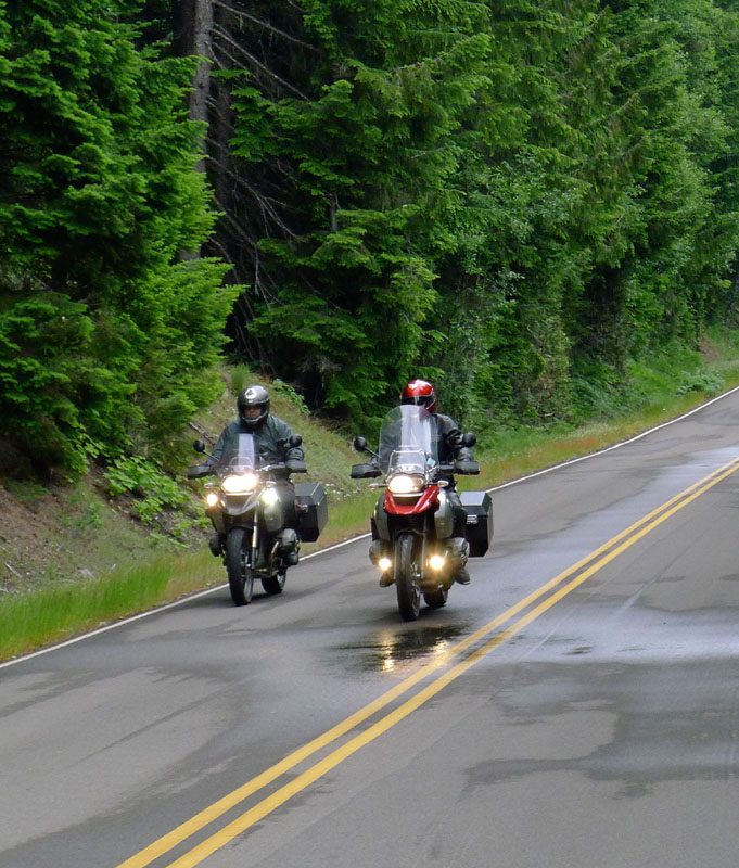 Lately Michael and I have adopted the method Brutus and I used in Europe to get our riding photographs. Because both of us had cameras, one would ride by while the other photographed, then keep riding on while watching for another good background, where he would stop to shoot a few of the following rider. "Leapfrog photography," we called it. It also happened that the camera Brutus had - a Panasonic Lumix with a Leica lens - took particularly good pictures in dim light. That had been well proven in England, and after I bought the same camera for Michael, we would notice the same effect in the similarly gloomy light of the Pacific Northwest. With both of us taking photographs, we could collect plenty of them without taking too much time from the day's journey.