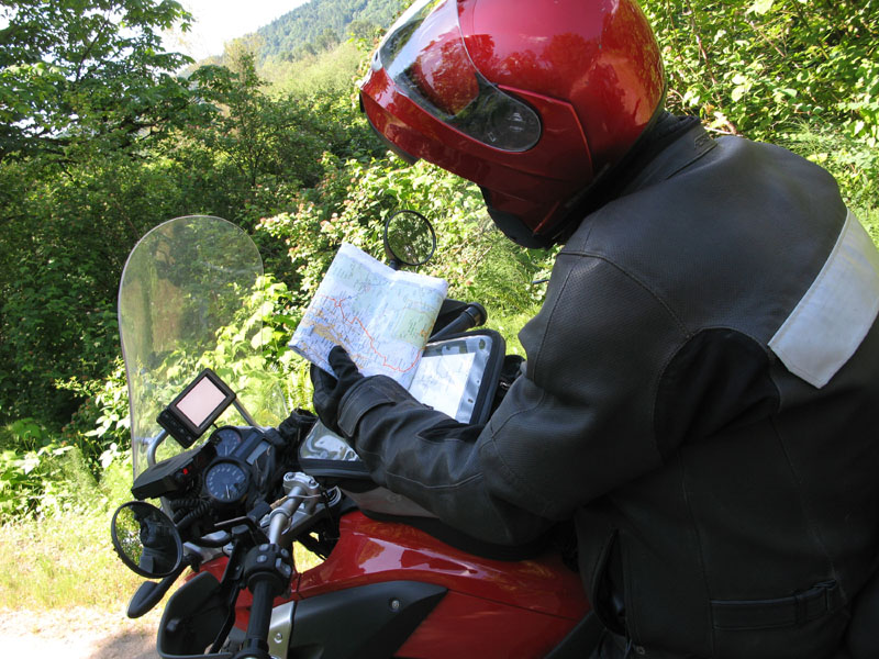 It made me very busy that first day - riding the ride (looking after my own safety and "place on the road"), leading the ride (making sure Michael and Brian always knew what I was going to do, and glancing back from time to time to see that they were always in view), and navigating, too. But it worked out fine. When a doubt appeared in my inner Doofus, I signaled the boys to the side of the road, and had another look at the map.