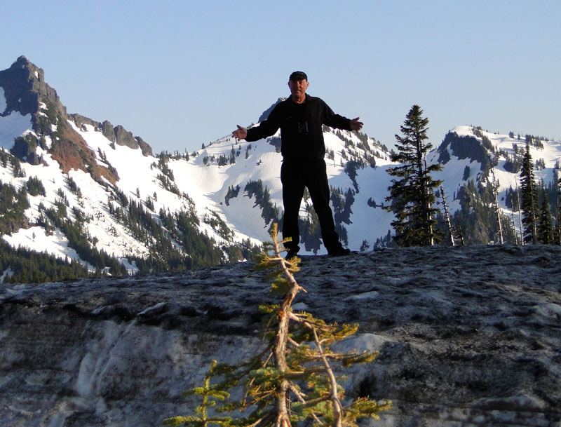 Looking up at Mount Rainier's radiant white dome from the hotel parking lot, Brian remarked, "To think it goes up another nine thousand feet!"