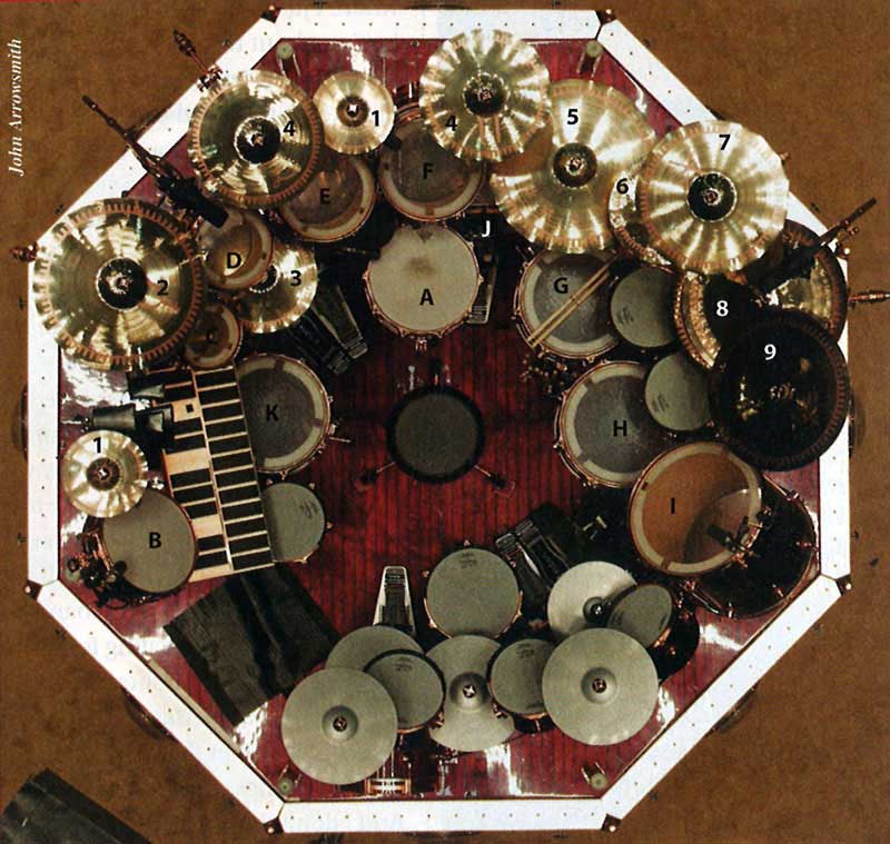 Electronics: Roland TD-20X percussion modules, V-Drums pads mounted in DW shells, V-Cymbals, V-Hi-Hat, and XV-5080 samplers; Kelly SHU internal bass drum mic; Alternate Mode MalletKAT Express and FatKAT trigger pedals; Dauz trigger pad; Glyph hard drives; Monster power conditioner; Behringer line mixer