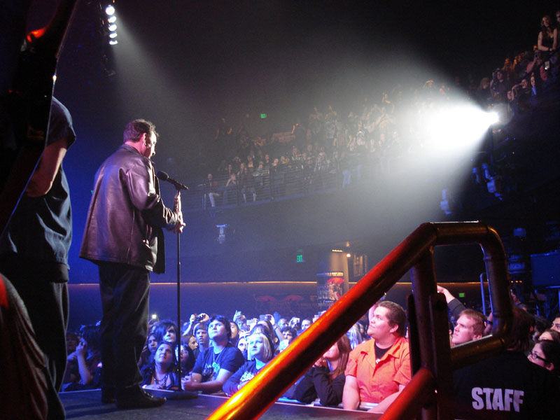 We left the backstage parking lot and walked into a dark, crowded theater, and my senses were brutally assaulted. Strobing lights slashed and flashed in the darkness, and the air throbbed with noise from grinding guitars and double-bass pedals triggering samples (an insult upon the ears and sensibility of an old-school drummer). Flamboyant (an errant finger just coined a neologism: "Glamboyant") rock people filled the hallways, and with head down to avoid being "noticed," I glanced around in disbelief at a phantasmagoria of wild rock costumes, spiky black hair, and tribal makeup.