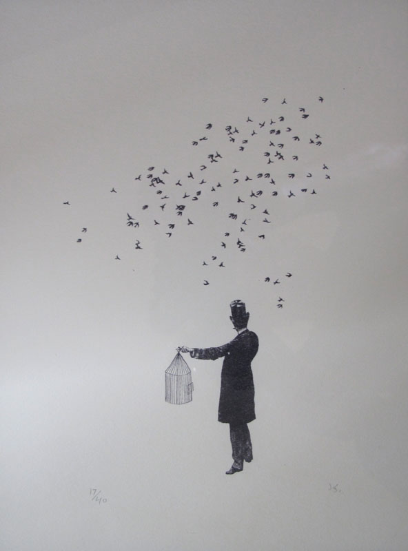 This print was given to me by my friend and fellow bird-lover Craiggie. He found it through a serendipitous thrift-shop connection, and knew I would like it. The image of a Victorian gentleman setting free a flock of birds from a wire cage would seem a happy and blameless image, and a pretty metaphor. But alas, Craiggie and I knew that the reality was far from happy, blameless, or pretty.