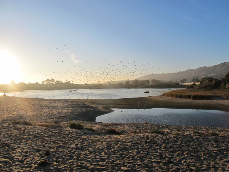 Here is another deceptive image of birds in flight. The scene is Malibu Lagoon, nearing sunset on a Sunday afternoon in December, 2011. The beach was tranquil, only a few small groups of people here and there, silhouetted on an isthmus of sand between the surfer-dotted Pacific and the waterbird-dotted lagoon.