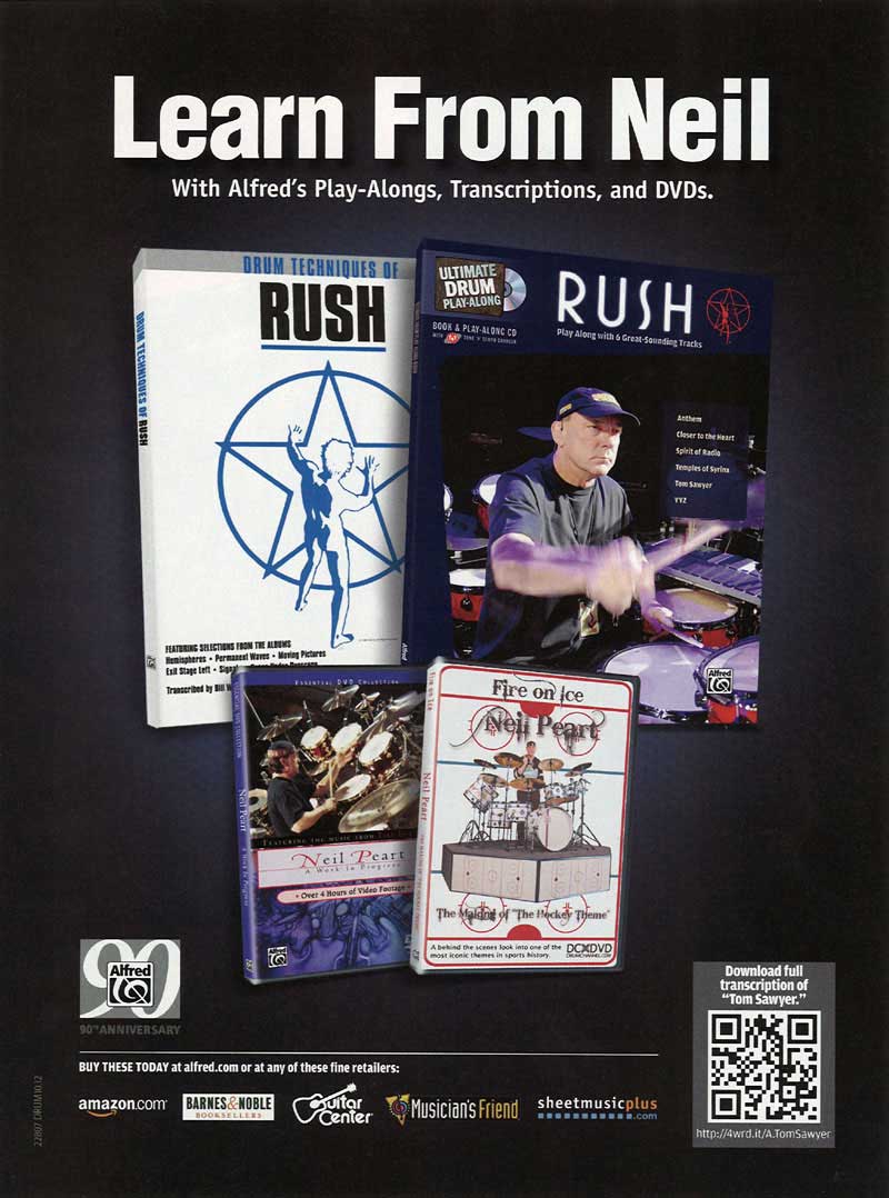 Rush's latest album is more than just a bunch of odd time signatures and groupings. There's plenty of the 4/4 "dirty-greasy groove" that Peart has worked so hard to develop. Two such examples can be found in the album's fifth and sixth tracks: "Carnies" and "Halo Effect." Both tracks feature Peart playing heavy rock grooves with a snare backbeat on 2 and 4 supported by syncopated bass drum patterns. We couldn't resist the cliché bass drum technique question: Heel up or heel down? Peart's response, "It's all heel up and a lot of force on the bass drum."