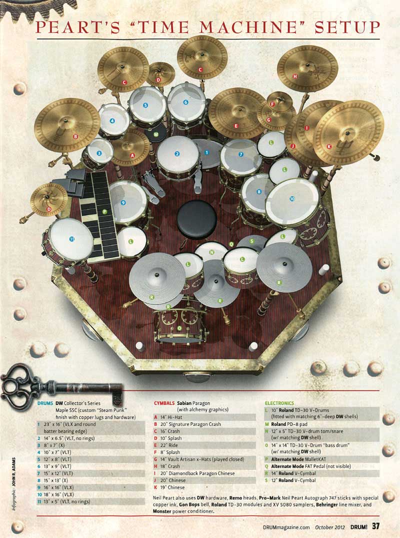 But with 20 individual acoustic and electronic drums, 18 cymbals, a rotating riser, and a jungle of hardware to navigate on the steam punk-themed setup, the tech's attention can't waver for a second. "Neil is surrounded by the kit. It's not a case of where I can slip in there like I can with other drummers who play smaller kits," says Wheaton from the band's Toronto rehearsal space. "So when we break a snare head, he plays something else till we get to the end of the song, then he darts out of the kit, I jump in, switch the head, and then he jumps back on. That's the only way we can do it."