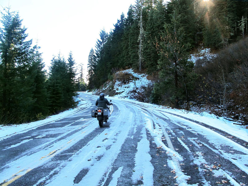 Early the following morning, cool and misty, we set out from a Walmart parking lot in Grants Pass, Oregon. The paper map showed a tiny gray line leading down into Northern California, and although it was marked as paved, I wasn't too alarmed to find us on a gravel road, winding through deep conifers. But as Doofus and Dingus kept making turns onto ever-smaller routes, mere gravel tracks and abandoned logging roads, I began to wonder. I tried to keep an eye on the compass, to make sure we were tending south. Then I began to see patches of snow here and there, and started worrying.