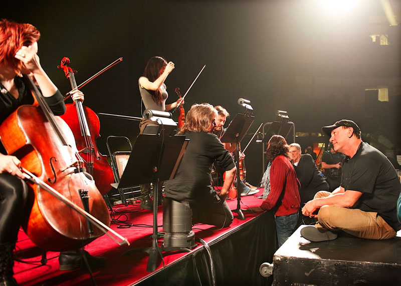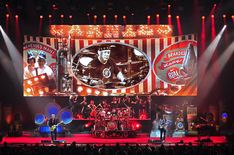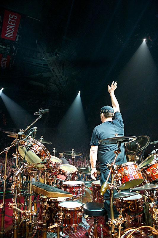 Before soundcheck at the final show, in Houston on December 2, the three of us gathered in front of the string players, which had become a daily custom. After they had tested their instruments and monitors, and before we all played together, I would sit cross-legged on the subwoofer behind my drums, while Alex and Geddy came in from their sides of the stage and we talked and joked for a few minutes with the "stringers."