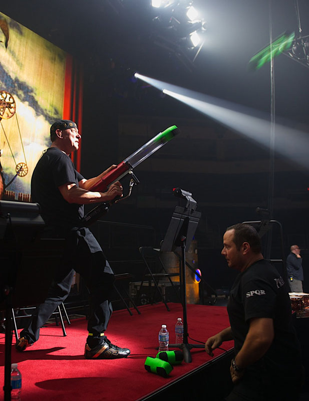 Michael soon took over as my weapons-handler, while John "Boom-Boom" Arrowsmith, our pyrotechnician and daily-events photographer, prepared the "ordnance" (T-shirts tightly bundled in fluorescent tape - so people can see them coming!). I run out for the encore, and Gump hands me the loaded gun. I climb up on the strings riser, and wait for the lights to come up on the audience (again, I want people to see the flying shirts - don't want anyone getting hurt). I fire the first two rounds, then bend down to let Michael reload while I turn the dial to prime the pressure. Soon we had it down to a tight routine, and were getting off four separate shots. Then I would lay down the gun and scramble across the subwoofer to the drums, ready to start "Tom Sawyer."