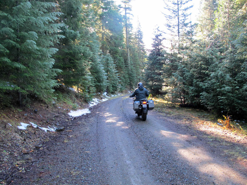 Further episodes in this story will show that we can get through most obstacles - eventually - but not deep snow. Still "the Boys" kept leading us onward, the purple lines on our screens turning this way and that. It seemed like they were just plotting a more-or-less random route, with Michael's applied "stencil" serving as a rough guide to its shape and direction. The riding wasn't unpleasant, but its aim was worrisome, and when I eventually saw a small brown-and-white sign, a marker for a National Forest road, with a number, I felt a sense of relief. "At least we're on a road that has a number." By that point, after rambling through endless evergreens on logging roads with no sign of recent tire tracks, it seemed like civilization.