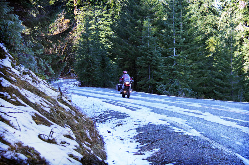 Then came the "false dawn" of a glimpse of paved road. It might have been the one we were supposed to be on the whole time - though at least two hours earlier, without all that meandering around the rainforest - and it led in the proper direction, toward the southwest. The problem was that it took us higher, and more snow was appearing. Eventually, as shown in the opening photograph, we were threading narrow lines of pavement between streaks of packed snow and ice. Worse was the fear, after previous episodes in Oregon, New Mexico, and Washington State, that we could soon be marooned in a snowpack.