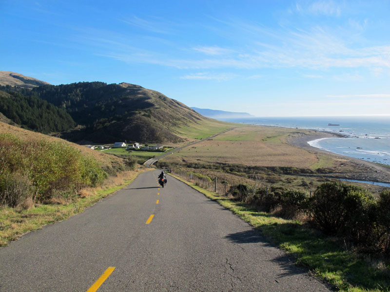 However, technology wasn't finished messing with us yet. The transplanted route-map worked fine once we were back on major roads, and we made our way over to the main highway, California 101, and a few miles south to the turnoff for Cape Mendocino - the Lost Coast. Brutus and I had explored that area back in 1996, on the Test for Echo tour, and I had passed through on my Ghost Rider travels, in 1998. A few years later I returned by car, taking a long scenic route home from a track day at Thunderhill in my Aston Martin DB9.