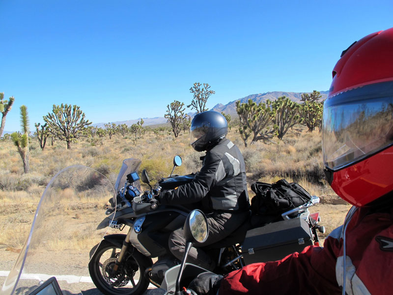 At this point, I stopped and straddled the bike and waited for Michael - hanging well back out of my dust. (For that reason, a crosswind is welcome when riding in the dirt.) I put on my four-way flashers and held up my hand - the understood signal for a photo stop - and asked him to photograph me riding through this background. Because, I told him, "It's the only place in the world where you will see both saguaro cactus and Joshua trees. And I believe the Arizona Joshuas are a slightly different species from the California ones."
