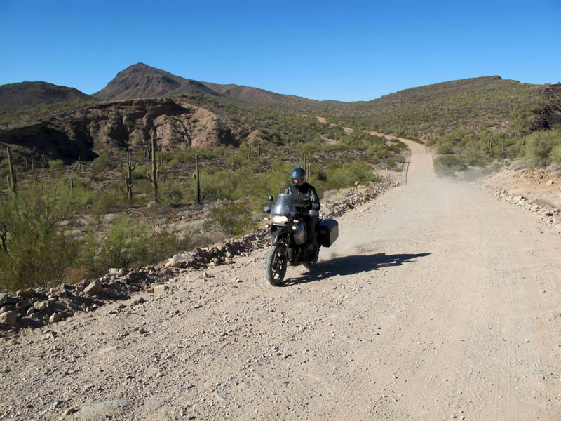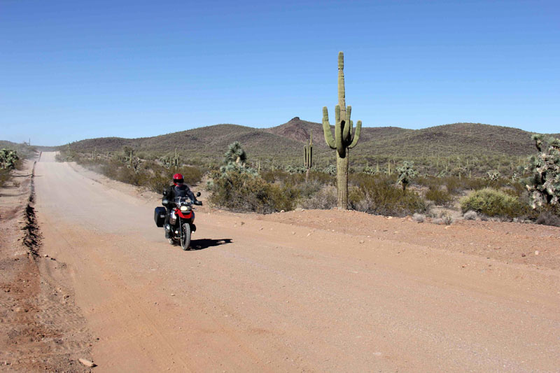 The signs that welcomed us to a couple of long stretches of gravel, and an eventual rather desperate plight, were only mildly daunting. Most of the time, these "primitive roads" were decently graded gravel, and the riding was fairly easy, through vast, rugged panoramas of saguaro, mesquite, and Joshua trees. After thirty or forty miles we came out to pavement again, and paused for gas around Wickieup. From there we turned west once more, into the Outback, on Chicken Springs Road. (You pretty much know a road with a name like that is going to lead you into desert desolation.) For a couple of hours everything was fine, more graded gravel and fetching cactus desert scenery. The temperature climbed into the eighties - the first time we had been truly warm on the bikes for about two months - and it felt just fine while we were moving.