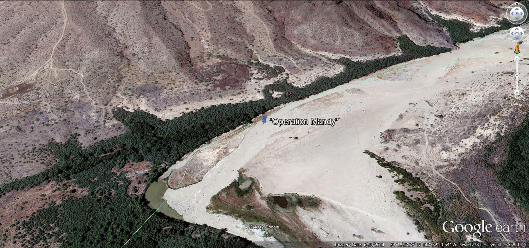 Finally we reached the "landmark" the first couple had told us about - the rusted carcass of an old-style, rounded school bus, about half of it buried under sand and gravel. (Perhaps a clue to a flood that had destroyed what used to be a road around there?) We had made it through the silt, a few inches of light powder over a hard surface, so not too bad. But now came the sand, and the other quad riders gave us the impression there was quite a stretch of it.