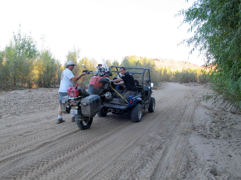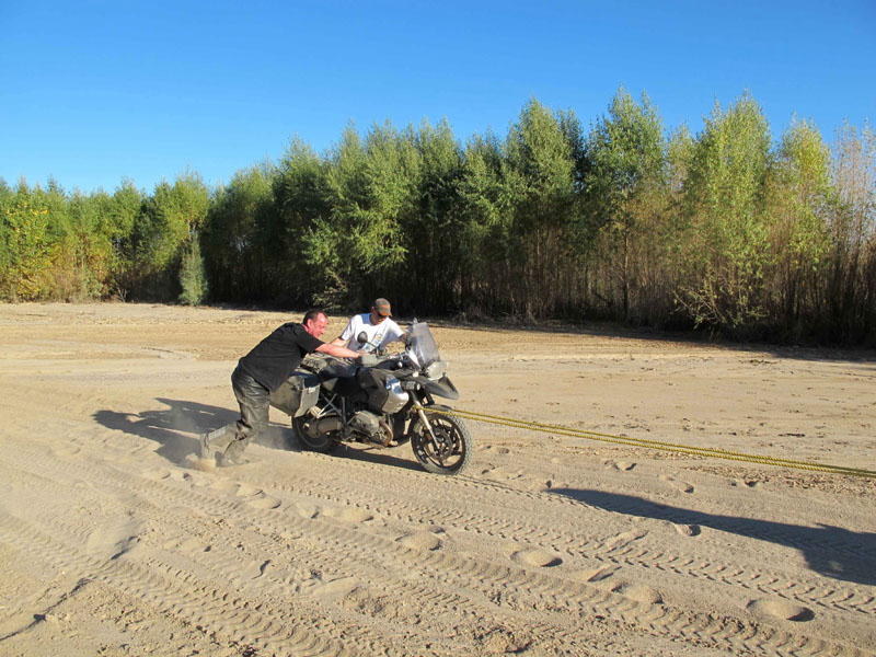 One couple had their dog with them on their quad, a black spaniel named Mandy, and I joked that I was going to remember this rescue as "Operation Mandy." The man called John brought over a length of heavy yellow rope - saying that his friends always kidded him about carrying it - and we tied it around the forks of Michael's bike. Tom, with the Harley shirt, and I held it upright while his wife, Cathy, pulled with the quad. It was still tough going, just keeping the bike on its wheels in that deep sand. Holding onto the handlebar and the luggage case, my boots scrabbling for traction, I was leaning so hard into it that it felt like I was supporting most of its weight. After a while I said to Tom, "I'm about to lose it." He said, "Me too," and called ahead for his wife to stop. (I liked how he always called her "Baby.")