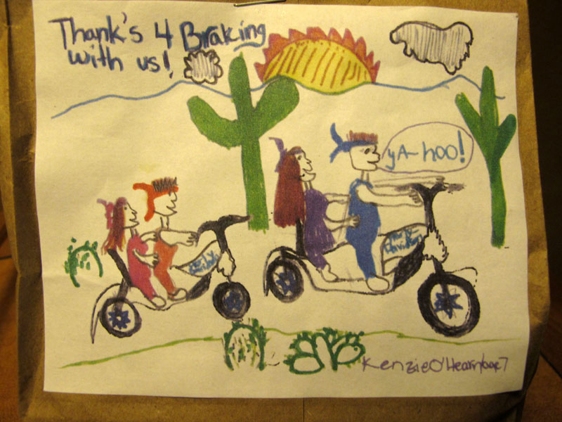 When Michael walked out of the lobby after checking us in, he was carrying two small lunch-size paper bags, and handed me one. "A present just for bikers," he said. The brown bag was decorated with the above artwork, by the owner's seven-year-old daughter - "because she likes motorcycles," the front desk clerk told us. (You have to love the "ya-hoo!" - and the "harley-davidson" on the tanks.)