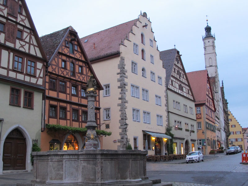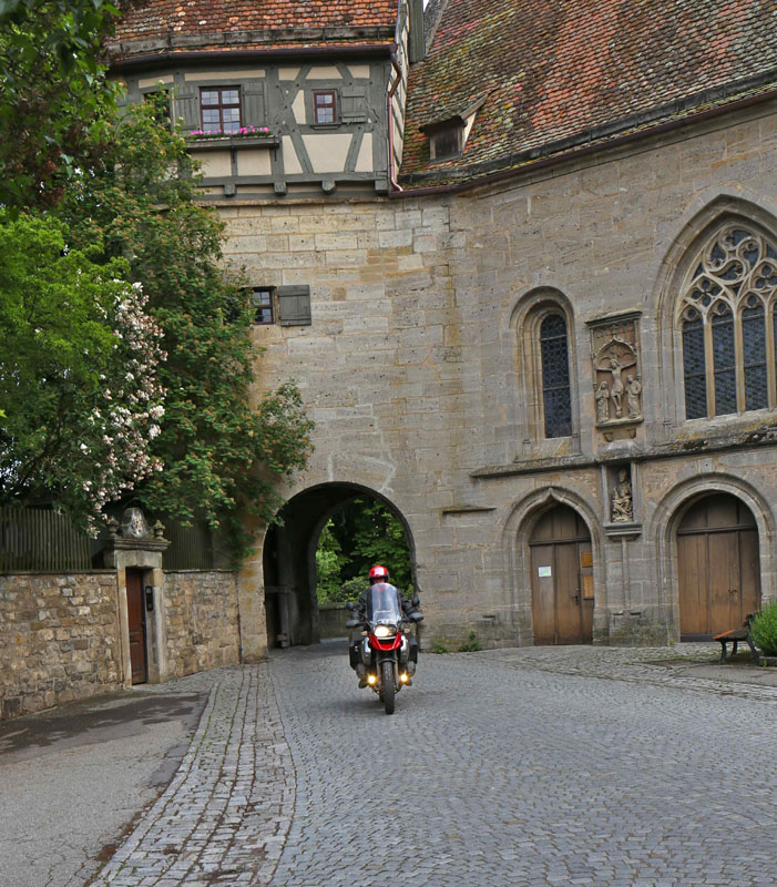 After a full day's travel through northern Bavaria that we later agreed was Germany's best motorcycling (as illustrated in all of the previous riding photos), second only to the Alps, Brutus's researches led him-and thus us-to this picturesque town in Bavaria. Rothenburg is regarded as the best-preserved medieval walled city in Europe, and it is very much a tourist showplace. During World War II, Rothenburg escaped the worst of the bombs and artillery that devastated other German cities only because of one of history's quirks. A high-ranking American general was aware of the city's history and beauty, and ordered it spared. (A similar sentiment saved Kyoto, the ancient capital of Japan, and an equally historic and picturesque city. Before the war, an American general had spent his honeymoon in Kyoto, and so aimed the bombers at places like Hiroshima and Nagasaki instead. In a further historical twist, Brutus and I saw busloads of Japanese tour groups in Rothenburg, drawn there because it was the setting for a popular animated series, Sugar the Little Snow Fairy.)