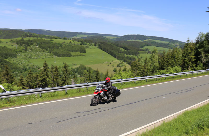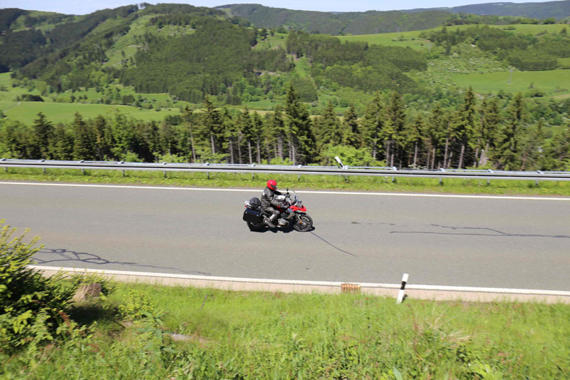 The inside lane was a solid freight train of trucks traveling at about 60 mph, while the outside lane was much faster, even sometimes "unlimited." So big Mercedes, BMWs, Audis, and Porsches came racing up from behind at well over 100. Our motorcycles, and especially our tires, were oriented toward sport and adventure riding, and were not comfortable above 90 mph. We were caught between the traffic's natural flow-pulling out to pass a truck through its turbulent wake, wrestling for control, and at the same time keeping an eye on our mirrors at all times. The road was straight and dull, yet the mood was tense and loud-not our kind of thing at all. But as with American interstates, sometimes it was a price worth paying.