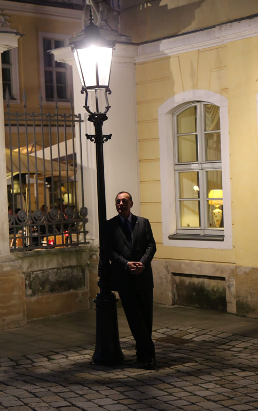 After dressing up for dinner at the hotel's fine restaurant, Brutus and I took an evening stroll in the city's vast central area, which was in the process of being redeveloped into something like its former glory. Dresden's heart seemed less baroque and "stagy" than Munich or Vienna, and less frenetic and edgy than Berlin-more like a plaza in a Southern European city. Sidewalk cafés overlooked a vast cobbled pedestrian area, the surrounding buildings splendidly illuminated, all centered on an enormous cathedral, the Frauenkirche. (It had lain in ruins, as a monument, from 1945 through the Soviet era, until its restoration in the early 2000s.)