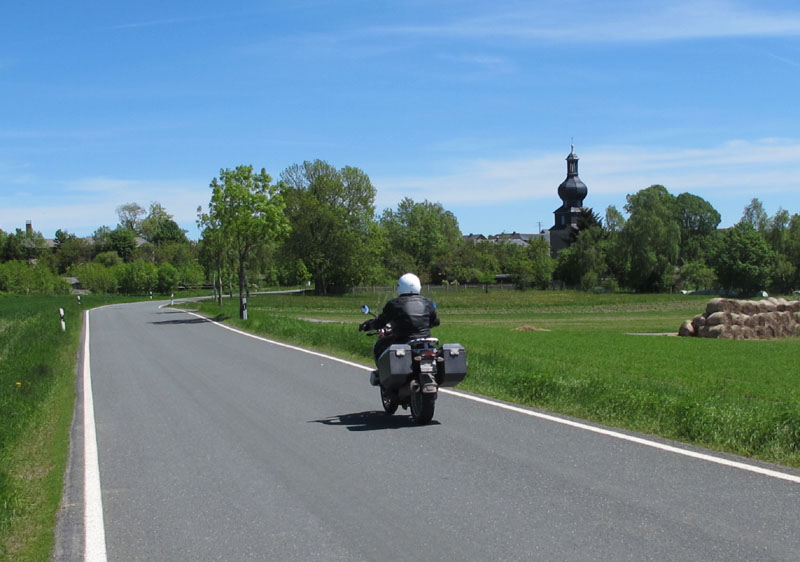 From Rothenburg, Brutus and I started out on the "Romantische Strasse"-Romantic Road-which connects some picturesque towns and castles in Southern Germany, ending at Mad King Ludwig's ultimate fantasy castle, Neuschwanstein. Riding north toward the show in Cologne (German spelling Köln), we enjoyed a few hours of shunpiking, following winding little roads past dark green forests and swollen brown rivers. But, with far to go to work that day, we eventually had to surrender to a lengthy stretch of autobahn. We did not love it.