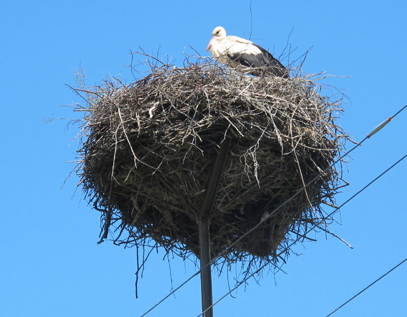 As in much of Northern Europe, wind turbines were sprouting everywhere, and that could be considered an admirable sign of modernization. To the eye of this beholder, those gigantic white propellers do not add to a landscape's beauty-but that is why they are most often placed where the landscape does not possess much beauty. The farms and villages were charmless, drably painted and without much in the way of parks, gardens, or decorations-save for the signature stork nests, great bundles of sticks built on platforms erected by the community, because a nesting stork is considered to be good luck.