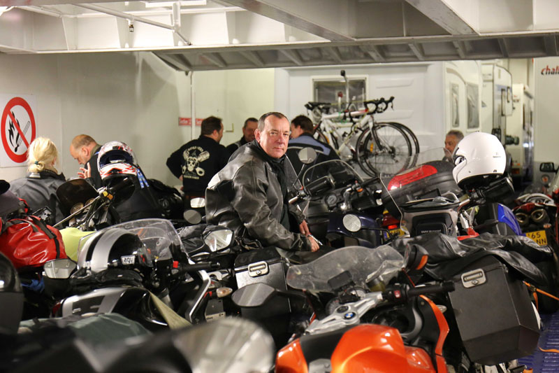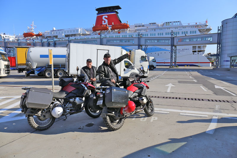 And at last we can move on to happier, brighter subjects-like overnight ferry rides. Brutus and I just love those! Like the boat from Newcastle to Amsterdam, the Baltic ferries usually run overnight, so we could have "a full day" on the motorcycles, and get to the port by mid-afternoon. I never mind the waiting time, catching up on journal notes and the Sunday New York Times crossword saved from the previous Saturday's International Herald Tribune, but you never know when Yellow Vest Man is going to appear and signal you to move-when you will have to quickly rearrange your belongings and riding gear, fire up the bike and get moving, to keep your place in line and not hold up others. Maybe you'll ride a few hundred yards to where another Yellow Vest Man signals you to stop. That often happened three separate times, and even then you wouldn't know if the motorcycles would be loaded first, or last. So the boarding process reminded me of one definition of soldiering-"long hours of boredom punctuated by moments of sheer panic."
