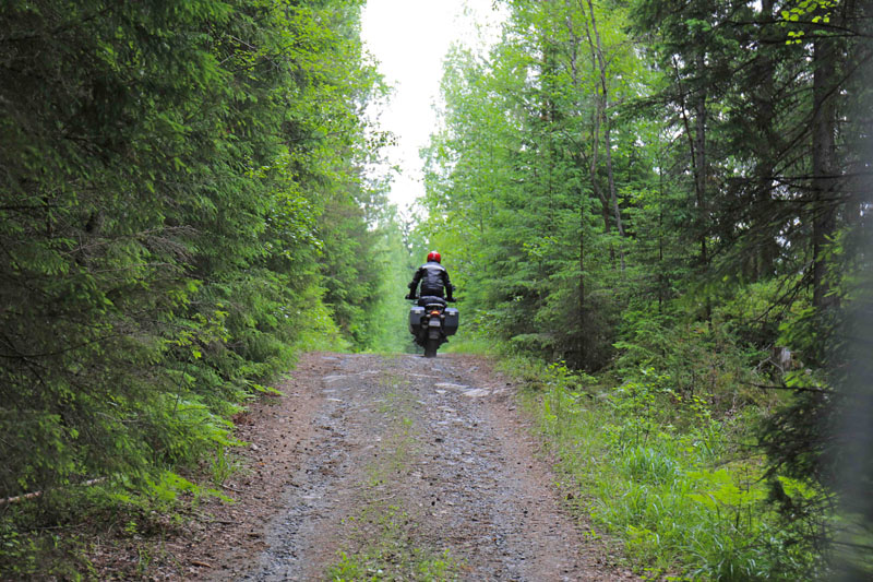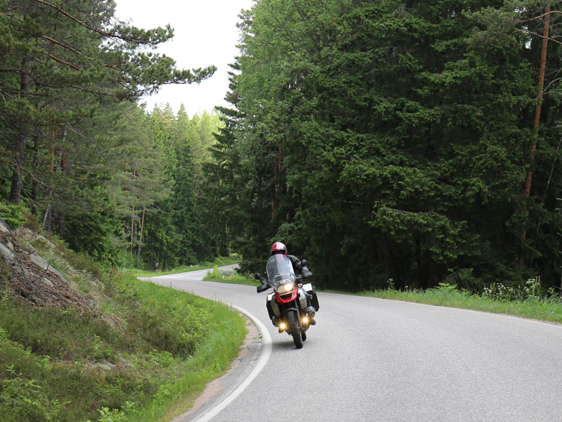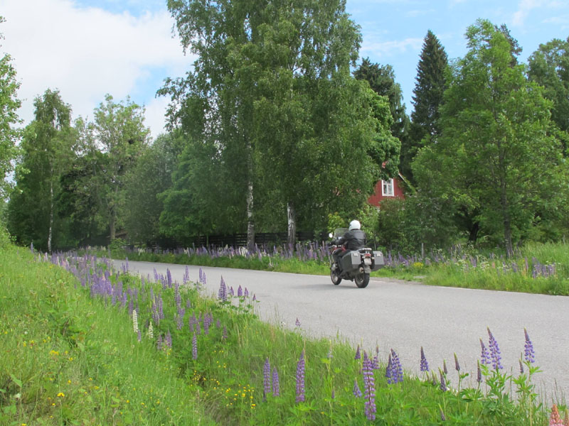 Brutus and I had ridden in Finland twice before, but both encounters were brief and rainy. This time we had a dry and mostly bright day, plus a masterpiece of a route by Brutus that included all the good kinds of shunpikers' roads-from logging tracks to lightly-traveled, nicely winding backroads through the rural countryside and mixed woodlands. (Forests cover three-quarters of Finland, though what we saw were second or third growth-but still, the trees were mixed somewhat "naturally" as opposed to the single-species plantations of Central Planning.) Among the familiar spruce, pine, and birch trees, I occasionally noticed a different kind of conifer, dark and drooping with graceful, gestural branches. As best I can deduce (just try to learn the name of one tree in the forests of Finland!), they were Finnish spruce, a variant of the Siberian species. In any case, just that one unfamiliar and attractive tree gave the woodlands of Finland a more exotic atmosphere.