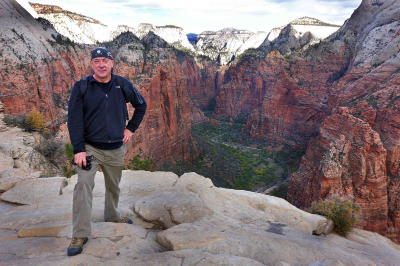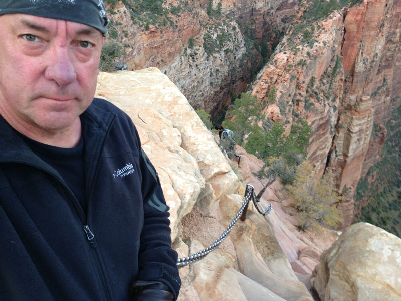 To open on a positive note - or positive chord, more like, G Major perhaps - this is a portrait of a happy man. And we do not use the word "happy" lightly. The attainment of where he is standing (Angels Landing) will be recounted soon, but the back story is important, too. The rock combo he had played in for thirty-nine years was on "indefinite hiatus," and his bandmates (the Guys at Work) had agreed not to even talk about work for at least a year.