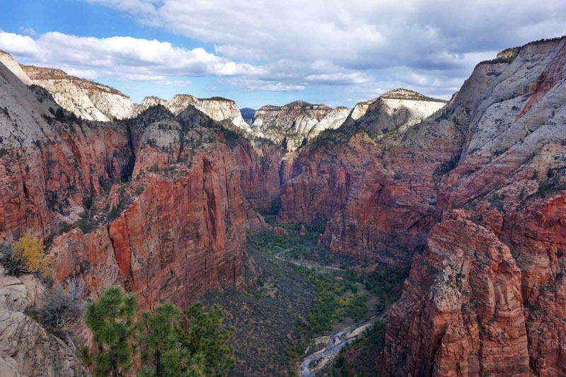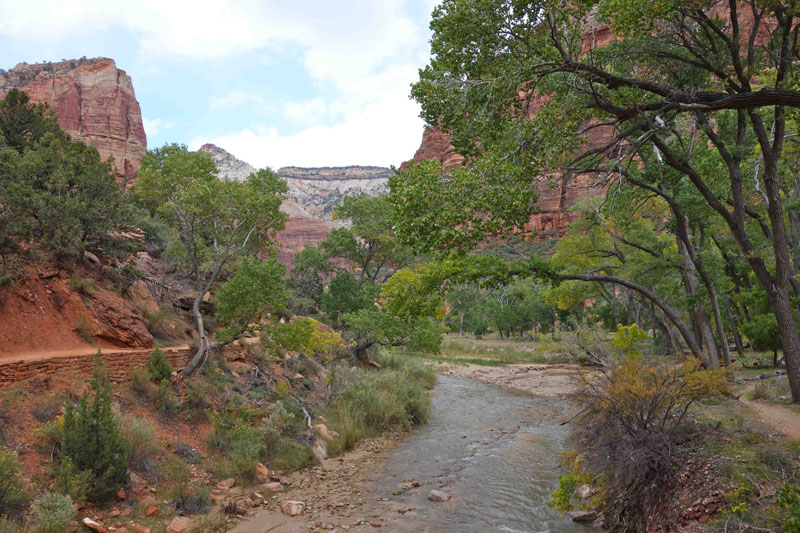 On first looking over the map of hiking trails and their descriptions in Zion National Park, I recalled that all those years ago I had chosen the trail to Observation Point. Snapshot memories brought back images of climbing high up the canyon wall to the rim, over rounded contours of eroded pink, cream, and brown stone. Waves of rock were smoothed and symmetrically grooved by eons of moving water, where tumbling stones in flashfloods had engraved the sandstone. The all-important lunchstop at Observation Point had offered a stunning view down over the valley floor, where the bends of the Virgin River (a modest stream compared to the torrents that formed that canyon) shone through leafy cottonwoods, green with airbrush bursts of autumn yellow. Nearly always I choose a hike to a high vantage point, whether a summit or an overlook, to enjoy lunch with a view. (And to go downhill on the way back.)