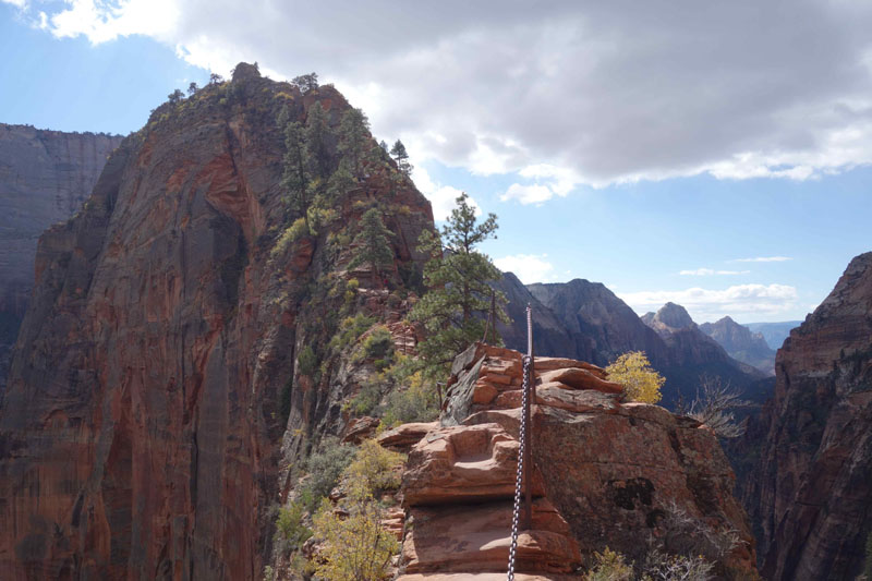The setting of this story's opening photograph, Angels Landing, is a vertiginous outcropping of rock at 5,875 feet. It is reached by a narrow, perilous trail along a slender sandstone "fin," with drops of over a thousand feet on each side. The above photo shows the chains that are bolted into the rock in many sections, as much-needed handholds. Lose your step here and you will fall a long way. A sign at the trailhead offered a grim warning, "Since 2004, six people have died falling from the cliffs on this route."
