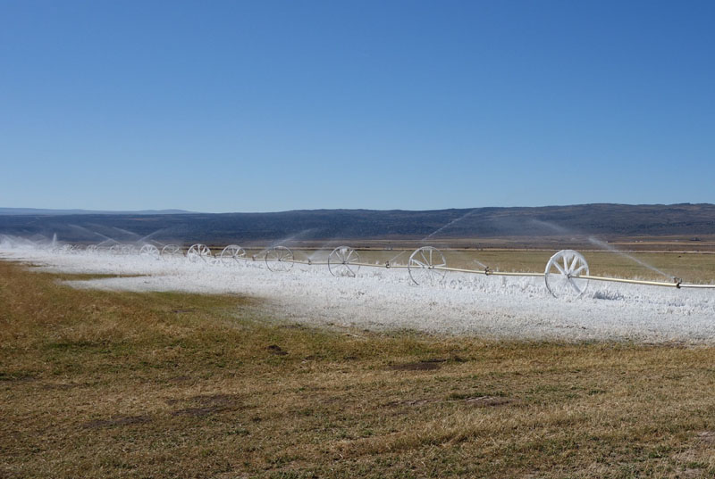 The road flattened out onto the plateau above the canyon, part of a vast geological upheaval called the Grand Staircase, rising strata of different eras of sedimentary rocks stretching from Zion Canyon through Bryce to Grand Canyon. (The National Park Service groups those three parks into what they call the Grand Circle, which makes sense now that I understand the geology.) Even on the plateau, the sun wasn't quite over the horizon yet, but the light was full over the open sage and juniper rangeland. The temperature was in the 20s, and under the center-pivot irrigation sprinklers blinding white frost had collected on the fields, making a surreal sight.