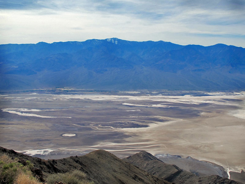 Looking out from Dante's View, at 5,475 feet, is overwhelming to the senses, and the topography is endlessly fascinating - even just considering the numbers. From my mile-high vantage, I looked down at Badwater Basin, almost 300 feet below sea level, and across the valley floor to the chocolate-brown alluvial fans of eroded debris (called bajadas when they join), and the wrinkled brown shoulders of the Panamints. The view centered on Telescope Peak, the highest summit in Death Valley National Park, at 11,049 feet.