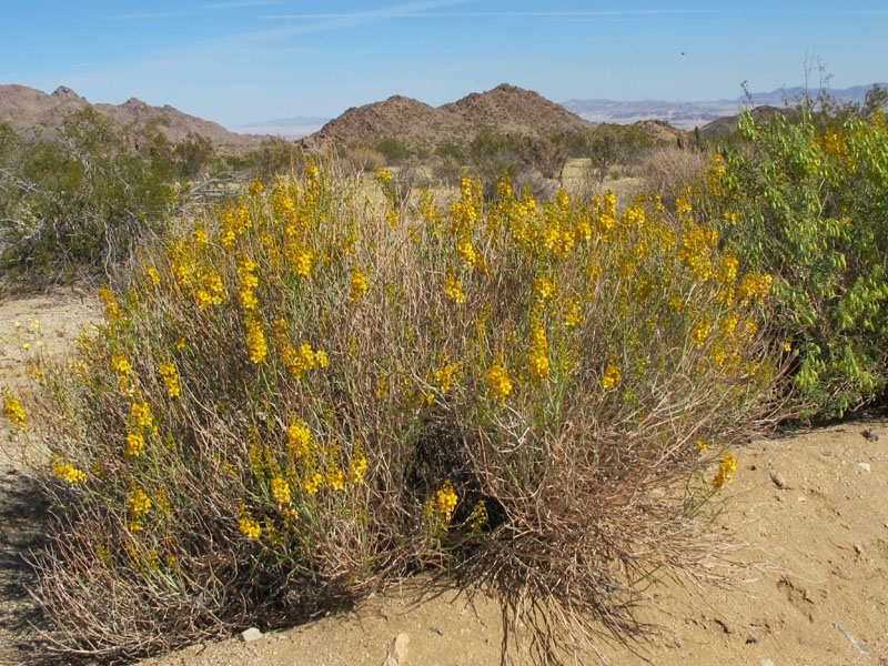 Mile after mile, with rarely another vehicle in sight, I rode through the Mojave's vast, oceanic sweep, distant brown peaks framing wide, gently undulating seas of patterned creosote. The creosote bushes grow in colonies, each a careful distance apart (either poisoning the soil around them with chemicals in their roots, or simply absorbing every drop of moisture - scientists are not sure), and collectively they are the oldest living organisms on Earth - some colonies over 10,000 years. A few of the creosote branches displayed their tiny yellow flowers, and I rode between tall, spindly ocotillos studded with blossoms like red jewels, and the fetching gesticulations of the Joshua trees. All the while, my eyes glanced down at the the evanescent wildflowers to either side - shy flecks of yellow, white, red, orange, and purple. Brittlebush, asters, desert paintbrush, datura, lupines, and a few others were familiar. Many others I couldn't identify, but they delighted me just the same.