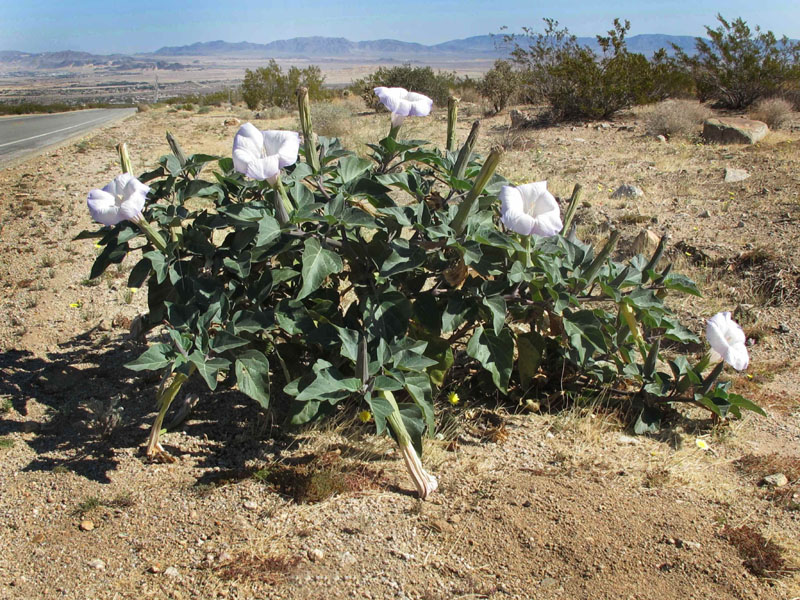 The rains had certainly been good for this sacred datura - the largest, liveliest plant of its kind I have ever seen in the Mojave. It glorified the roadside just outside Joshua Tree National Park, with Twentynine Palms in the background, and I saw several like it that day.