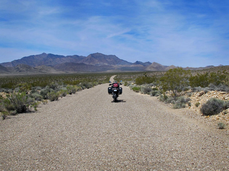 At the next fork, at Cima, I turned north to the intersection with Interstate 15, where I fueled up again. The temperature had climbed into the 80s, heading for the 90s, so I stripped off a few layers of gear, then crossed the freeway and rode back into open desert. A neglected, overgrown track of rough pavement called the Excelsior Mine Road curved west, traversing the remote, mostly abandoned mines of the Kingston Range. It climbed to a narrow, rocky little pass called after the next town, Tecopa, and I knew things could get difficult there. It was my third time passing that way, and the first time the unpaved pass had been rough; the next time it was even worse, and I was worried that by now it might have deteriorated to impassibility. One flash flood could do it. However, the Tecopa Pass had obviously been graded recently, which meant there was some kind of economic activity continuing around there - because it still followed my basic definition of a road's purpose: "Money at one end, a bank at the other."