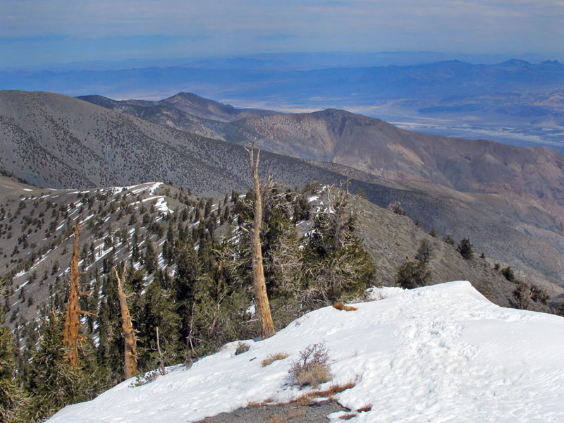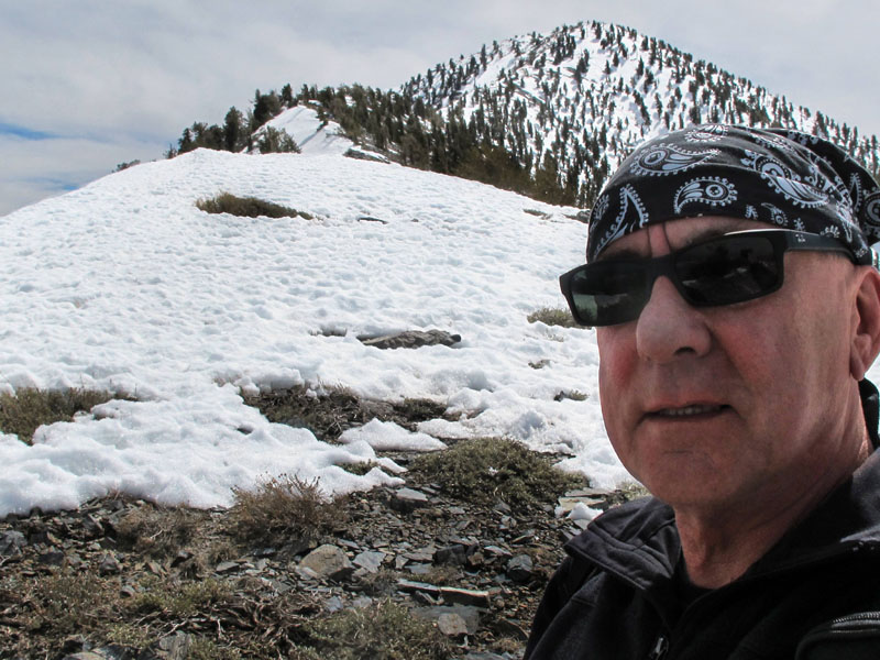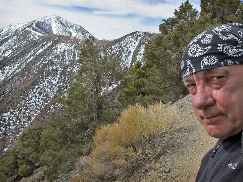 A couple of miles later, maybe a thousand feet higher, I rounded a point among the limber pines and saw the above view of distant Telescope Peak. And all that snow. The expression in my self-portrait echoes the "Are You Serious?" theme used before about cross-country skiing self-portraits, skimming downhill in a blizzard at zero Fahrenheit. This time I mentally added an expletive to that rhetorical question - for extra emphasis.