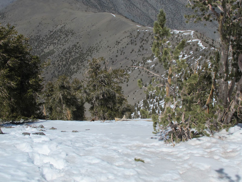 Five-and-a-half years later, in April 2005, I planned a second attempt on Telescope Peak, but was warned by the park rangers that the higher elevations had too much snow and ice to climb without winter mountaineering gear - crampons and ice axes and such. I didn't have any of those on my motorcycle. (Note to self: a man of your age and station ought to possess an ice axe.) So that day I hiked up nearby Wildrose Peak instead, at only 9,064 feet, and still had to work around or through a fair amount of snow.