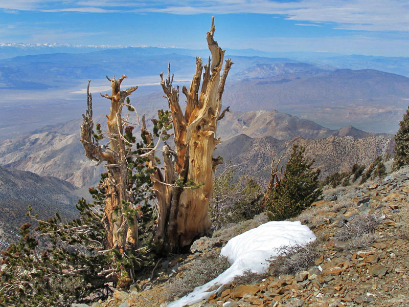 Compared to the ancient bristlecone pines that clung to the highest elevations around me, we were all children. Unborn cells, really. Apart from creosote colonies, bristlecones are the oldest individual organisms on Earth - as much as 5,000 years, dating to the time of the pharaohs. The example pictured above, with the Panamint Valley and the white line of the snow-crested Sierra Nevada behind, is actually still alive, despite being cruelly blasted by millennia of harsh weather and lightning.
