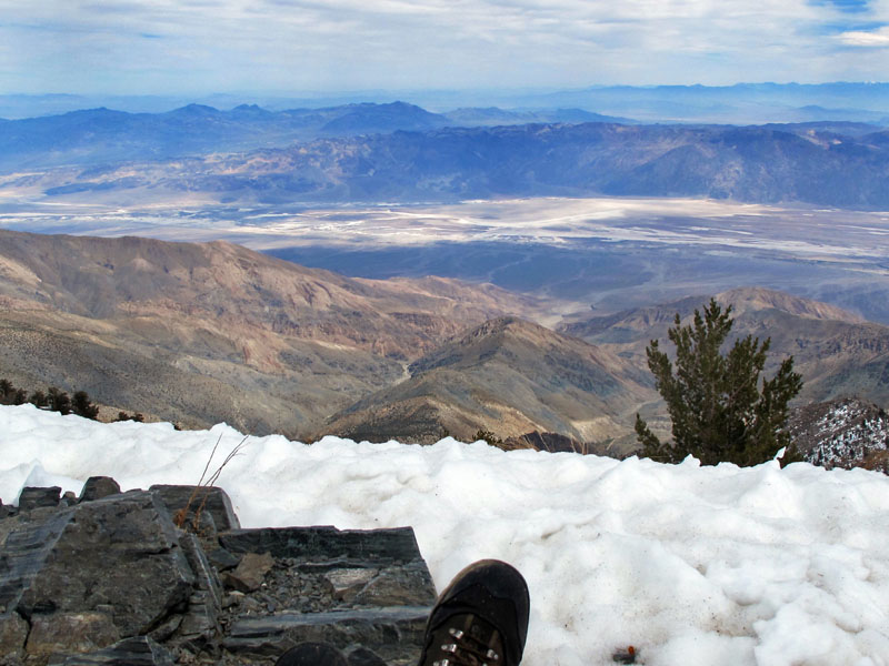 I eased myself down onto those sharp-edged rocks, and stretched my legs out toward a lingering snowdrift, facing down over Death Valley. One slab of rock offered a decent angle, and I leaned back against it, feeling nothing but relief. (Though always with an undercurrent of anxiety, still facing the long, perilous descent.) Taking my time, I looked around at the 360-degree view, drank some water, ate an apple, a stick of cheese, and a chocolate wafer bar.
