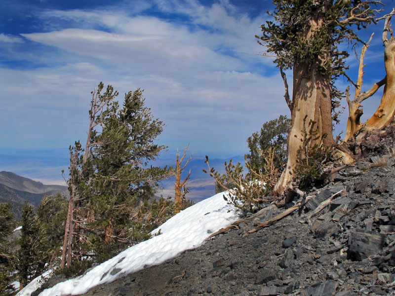 And that was just to get to the trailhead, at 8,000 feet. Then seven miles on foot up to the summit, through ascending ranges of sage, then juniper, then pinyon pine, mountain mahogany (another tree, like the giant sequoias and ponderosa pines, that needs fire to germinate), limber pine above 9,000 feet, and finally the ancient bristlecone pines, above 10,000 feet.