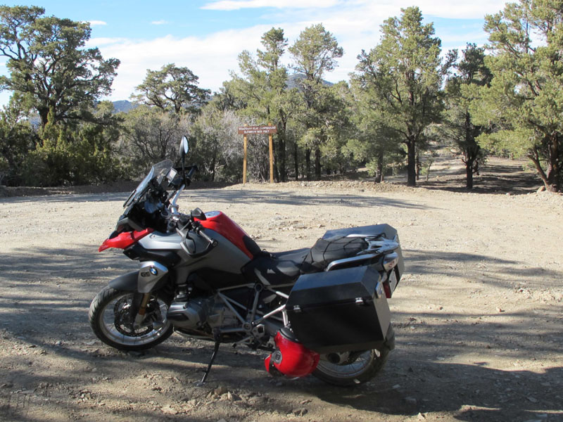 This time, on April 9, 2014, I rode up the graded gravel track to the Wildrose trailhead, beside the Charcoal Kilns (see "December in Death Valley," in Far and Away). The road was dry, but patches of snow remained among the pinyon pines to either side. (Death Valley has a double treeline - the usual upper limit beyond which trees will not grow, and a lower line, defined by heat and dryness, below which no trees live.) Climbing from there, a sign warned that high-clearance four-wheel-drive might be required. The track became narrower, steeper, and badly rutted, with solidified mud and gravel studded with larger rocks. I switched the motorcycle's traction control setting to "Enduro," to allow for some wheelspin, then stood on the pegs and bounced up another mile or so. I parked near the Mahogany Flats campground, at 8,113 feet.